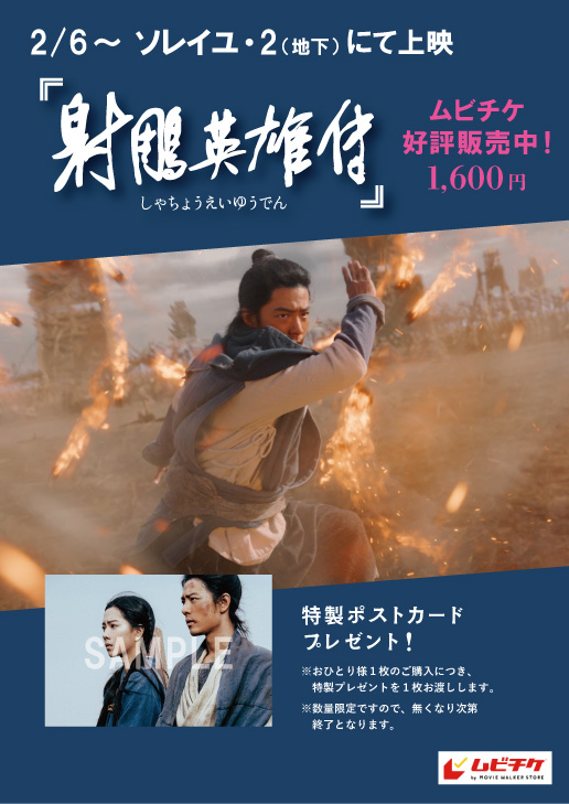 HOME > お知らせ > 2/6公開「射鵰英雄伝」ムビチケ販売開始のお知らせ 2025/12/16 2月6日よりソレイユ・2にて上映いたします「射鵰英雄伝」(しゃちょうえいゆうでん)につきまして ムビチケの販売を開始いたしましたのでお知らせいたします。 ◆料金:一般 1,600円(税込) ◆特典:特製ポストカード 数量限定につき、無くなり次第販売終了となります。 作品案内はこちらから⇒「射鵰英雄伝」 皆様のご来館をお待ちしております。 Twitter Share Pocket Hatena Pinterest LINE